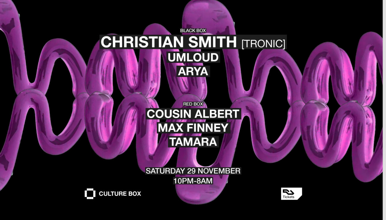 With over two decades at the top of his game, Christian Smith’s signature blend of bold, groovy techno has rocked dance floors across the globe. Founder of the legendary Tronic label—home to countless chart-topping releases—he continues to shape the sound of the underground with hits on Drumcode, Filth On Acid, Trick, Symbolism, Bedrock, and more. Don’t miss this exclusive set from a true master of the craft. Umloud and Arya set the tone with the opening and closing sets in the Black Box, framing the night with their deep, driving beats and sounds. Downstairs, in our more intimate surroundings, Tamara takes over and invites Max Finney and Cousin Albert for an all-night session of perfect grooves.
